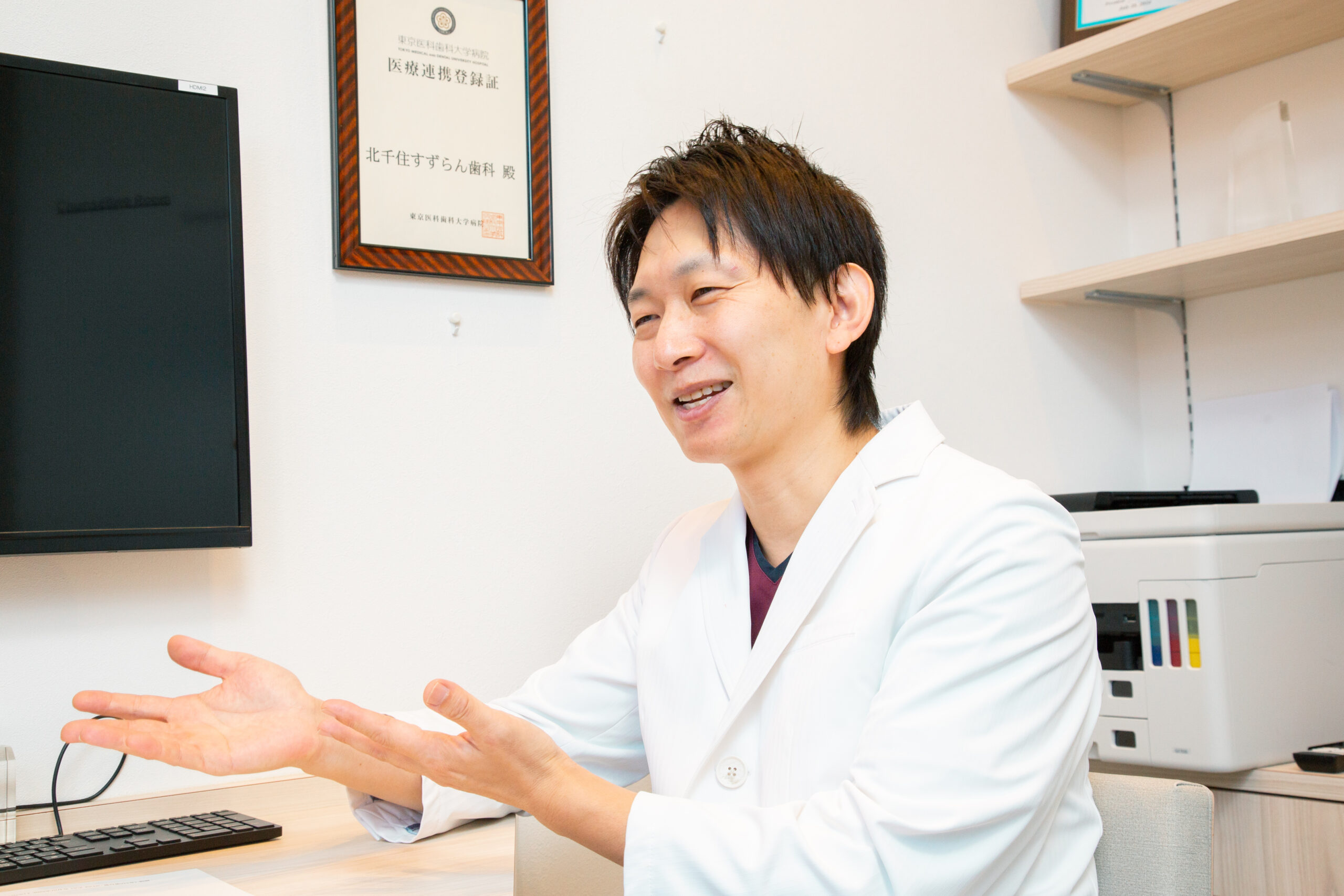 大平氏: 当法人は北千住と小岩と新小岩で歯科医院を展開しています。中学時代に矯正治療で通った歯科医院の雰囲気に魅かれ、患者さんを笑顔にする仕事に魅力を感じて歯科医師を志しました。