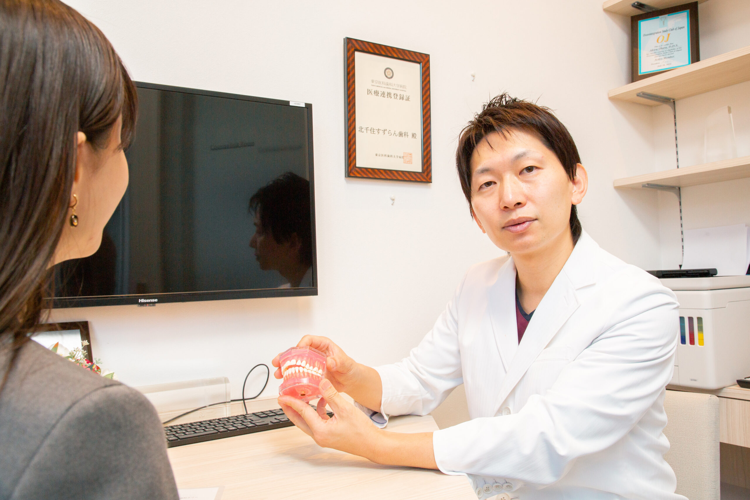 大平氏: 患者さんの生活背景や癖を把握し、原因にアプローチする総合的な治療を行っています。歯ぎしりや口の開き癖には生活習慣の改善促進と矯正治療を組み合わせています。