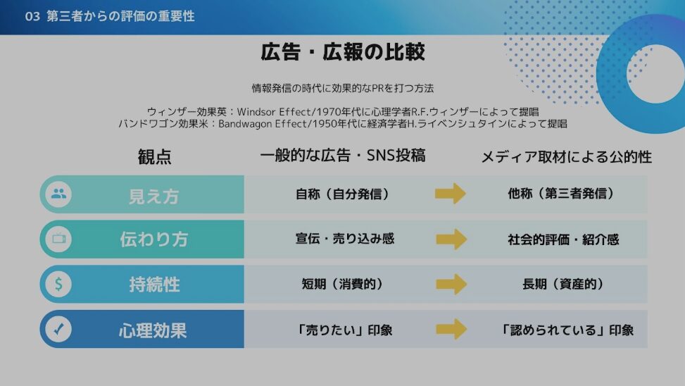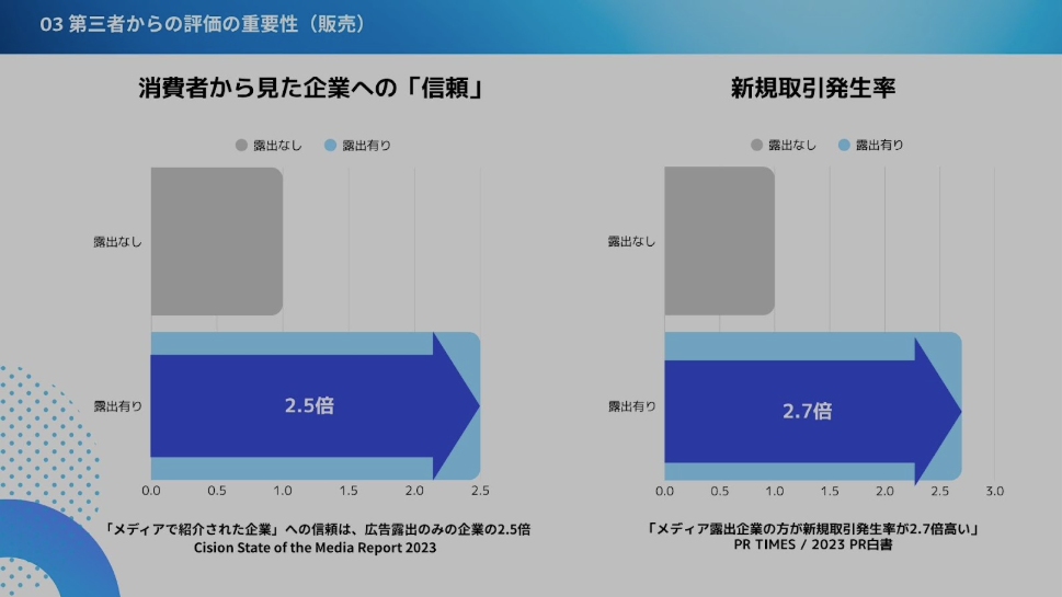 ◆第三者視点の信頼性 ⇒ 商品・サービス・理念などの認知の拡大、ブランド力の強化